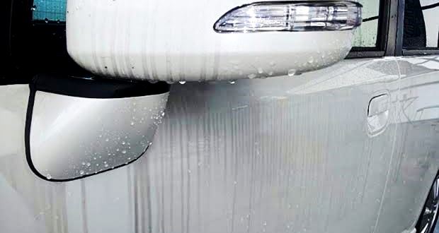 ①水(ホースまたは高圧水)で車全体を流し、砂ホコリを落としましょう。